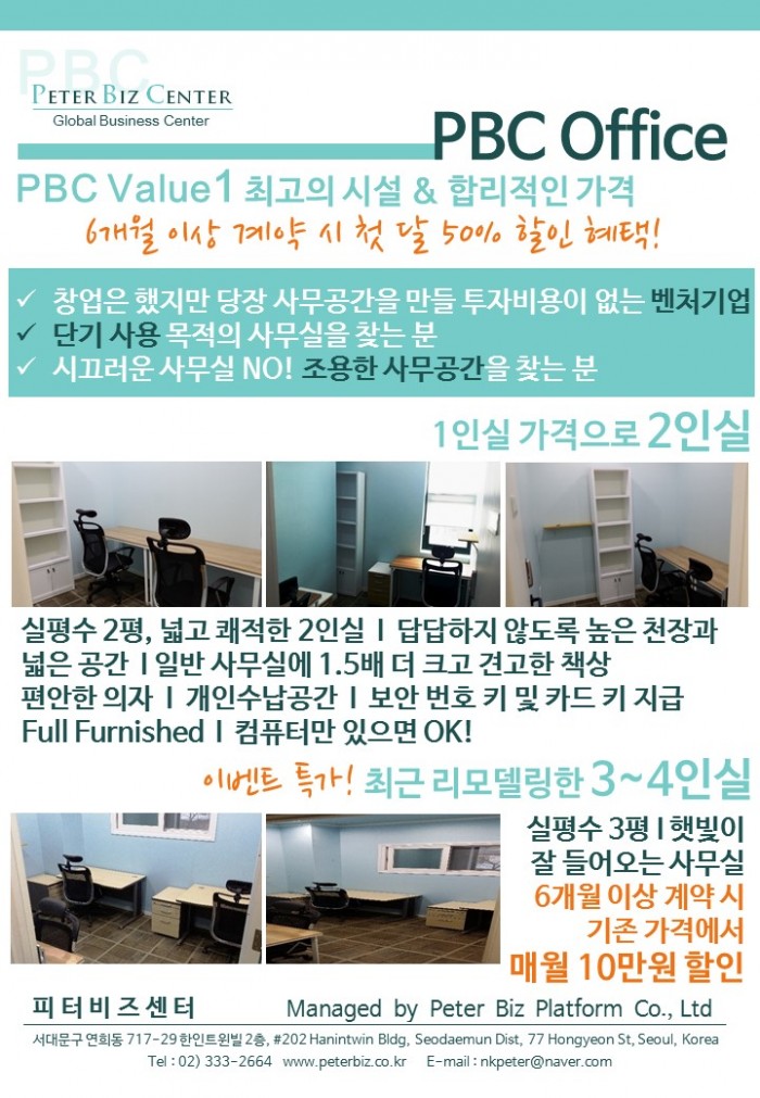 서대문구 연희동, 프리미엄 Cafe형 피터비즈센터 외부 창 있는 '5인 소호사무실' 을 월 80~90만원에 사용할 수 있어요. 6개월 이상 계약하시면 첫달 이용료 50% OFF.