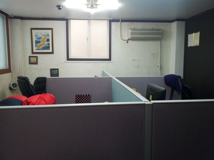 사무실 사진을 보시고 그중 벽쪽 양쪽 두 책상은 저희가 사용중입니다.