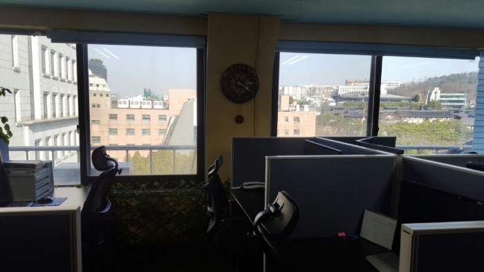남산과 한옥마을 전경이 내려다보이는 조용하고 깨끗한 사무실입니다.