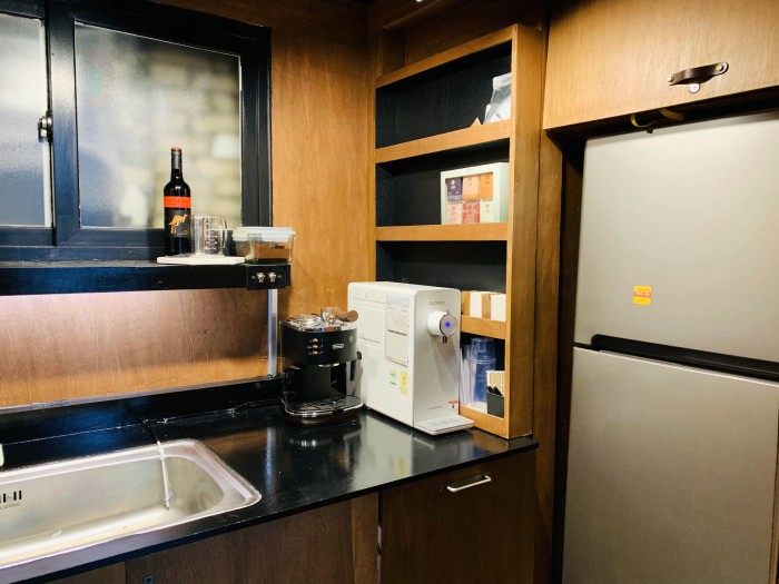 탕비실에서는 간단한 조리까지 가능하고 화장실은 실내에 있으며 남, 여 공용입니다.