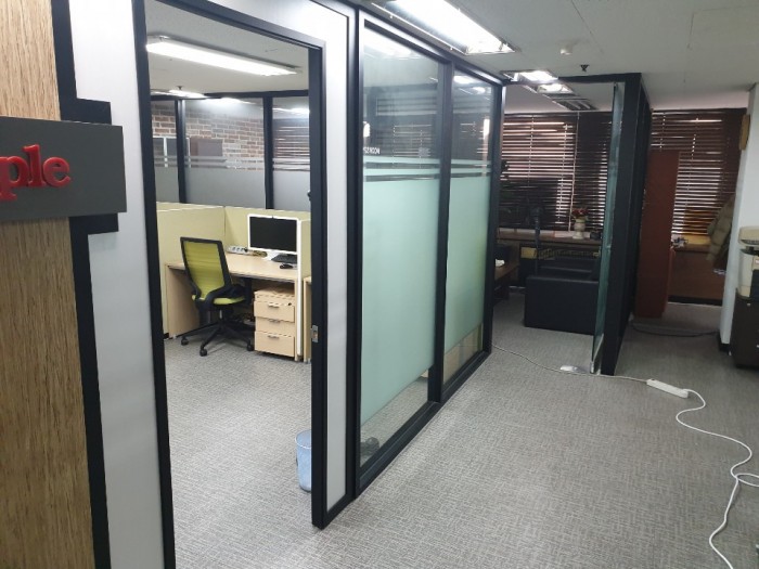 사무실 넓고 유리벽으로 칸이 나누어져 있어 각각 사무실처럼 이용가능