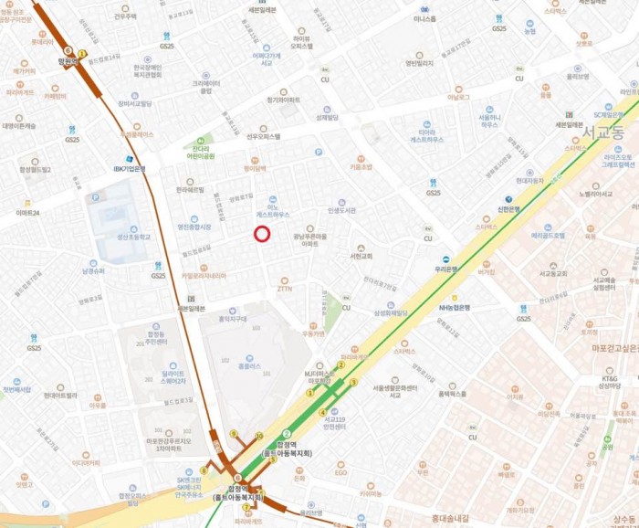 합정역에서 도보로 3~5분 거리에 위치해 있으며, 당산역을 이용하여 9호선 강남부근까지