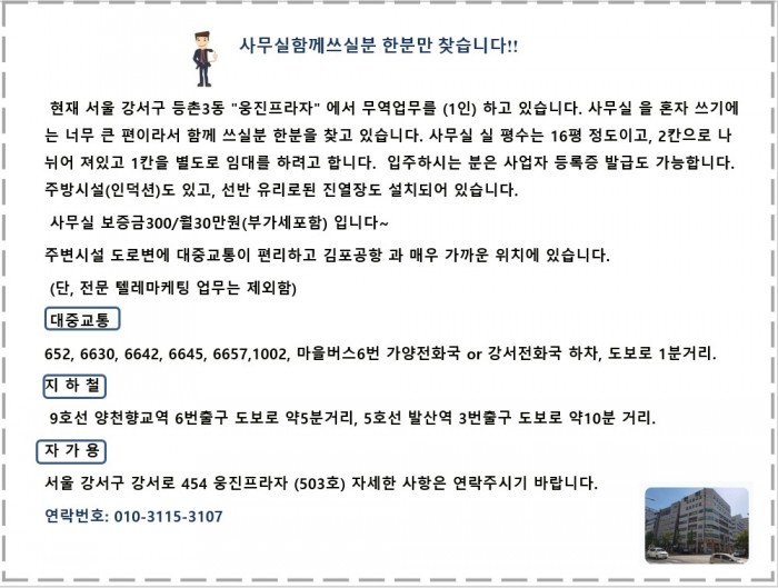 사무실 함께 쓰실분 한분만 구합니다~ 페이지 정보 작성자 우주 목록 보증금 있음|3000000|만원 월 비용 300000||만원 지역 건물명 연락처 010-3115-3107 주차장 02|2606|8498| (1|0|만원) 작성일 21-12-03 12:21 본문 댓글 0 댓글목록 등록된 댓글이 없습니다.