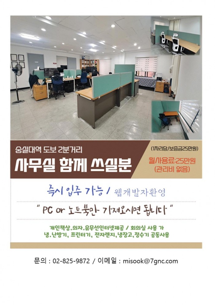 7호선 숭실대역 3분 거리 조용한 사무실
